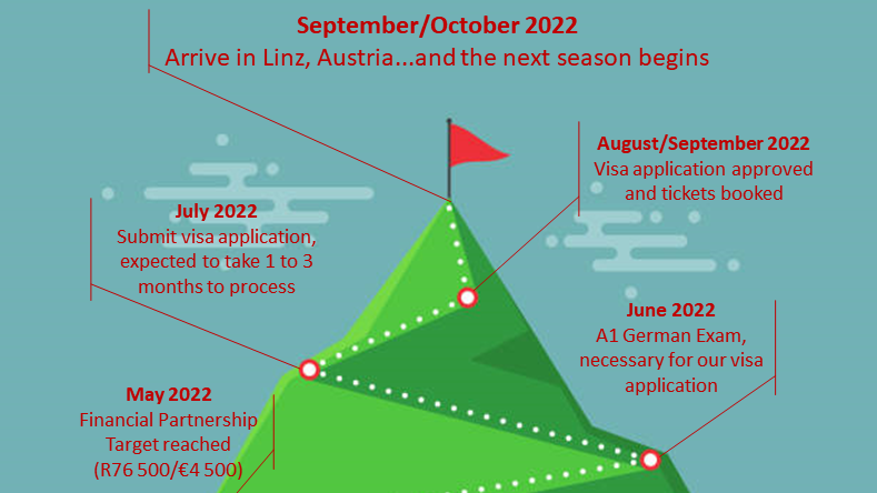 In our last update we shared that we aim to have 100% of our support by 1 June (and need 80% to start the visa application process). We are not there yet, but are excited to share that we are currently at just over 78%, with more conversations ahead with potential partners. We could reach our target by having just 22 people commit to 1% (R750/€45) per month. But we have partners contributing from R50 to a few thousand… so there is no amount too big or too small.